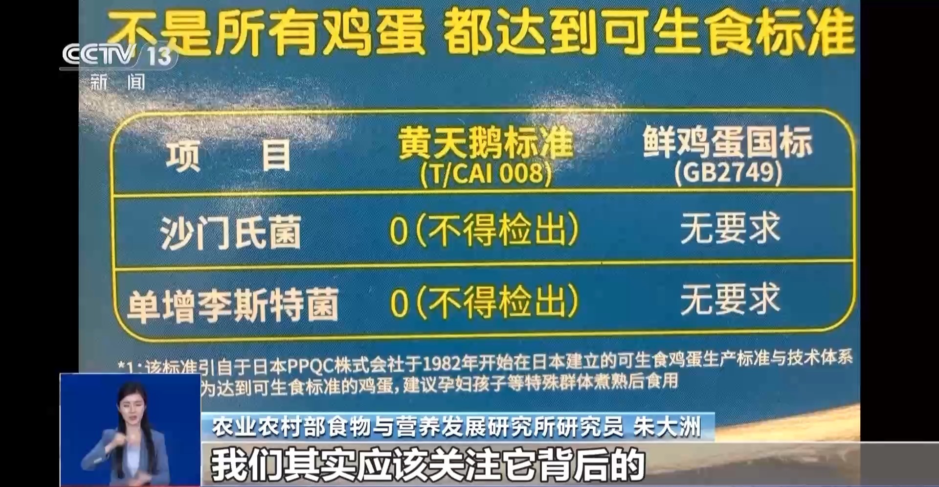 农业农村部食物与营养发展研究所研究员 朱大洲:购买可生食鸡蛋,其实应该关注它背后的产品标签,看它执行的是哪个标准。我们可以购买品牌影响力比较大、信任度高的一些企业的产品。