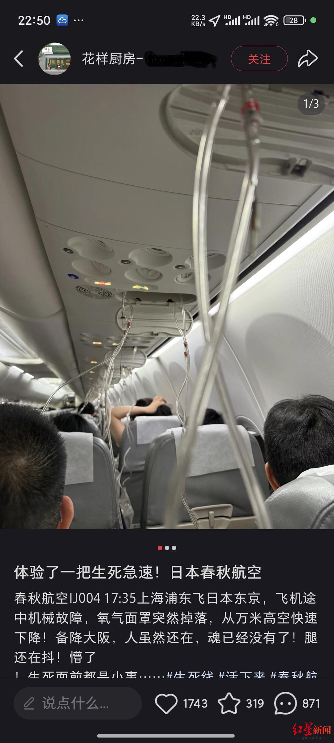 网友“花样厨房”在社交平台分享这段危险经历时说:“飞机途中机械故障,氧气面罩突然掉落,从万米高空快速下降!备降大阪,人虽然还在,魂已经没有了!腿还在抖!”另一名网友“洋观日本”也在社交平台表示,飞机起飞1个多小时后,据说油压系统出问题,紧急降落,氧气面罩都下来了,大家吸氧了20至30分钟后才平稳,飞机现已迫降(大阪)关西国际机场。