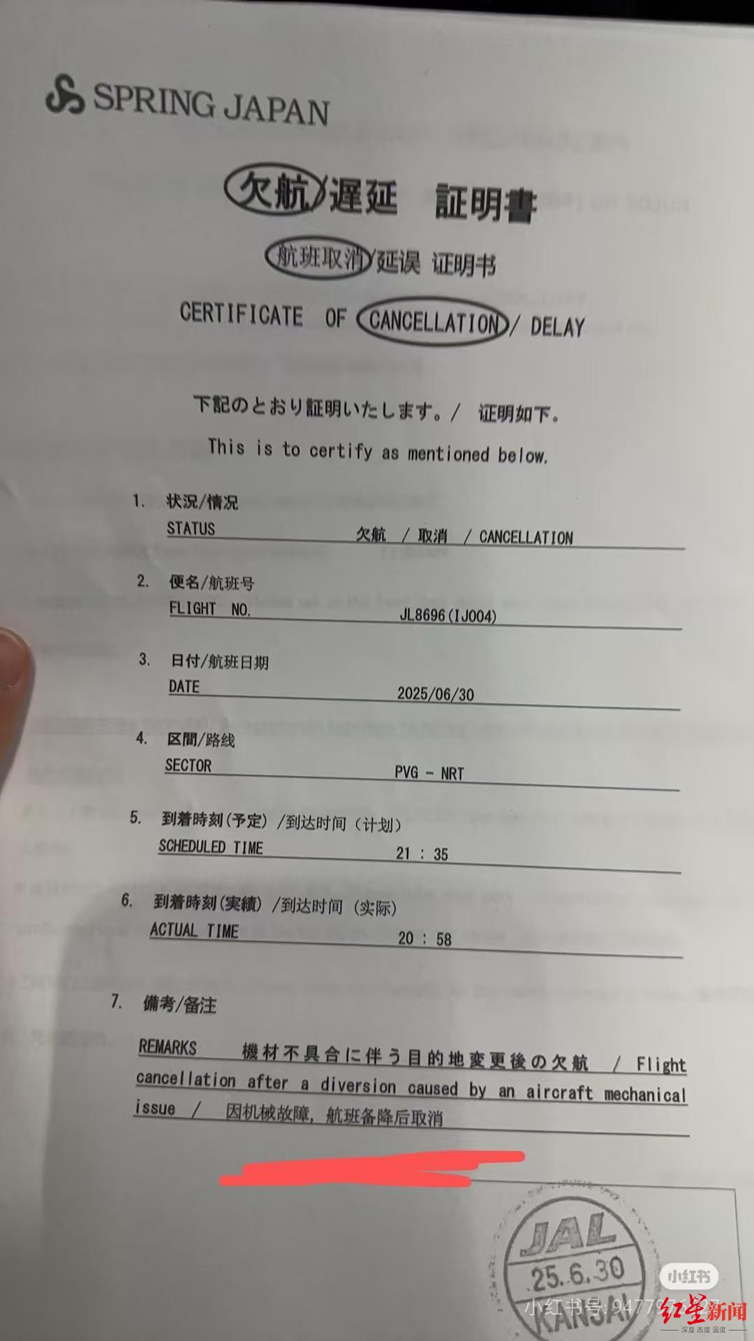 红星新闻记者获得了部分游客发布的航班延误证明书,上面显示因机械故障航班延误后取消。